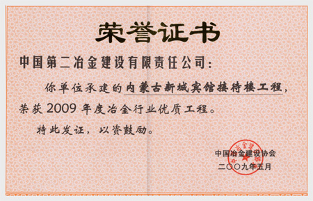 內蒙古新城賓館接待樓獲冶金行業優質工程、中冶集團優質工程、內蒙古自治區優質樣板工程、內蒙古自治區用戶滿意工程。