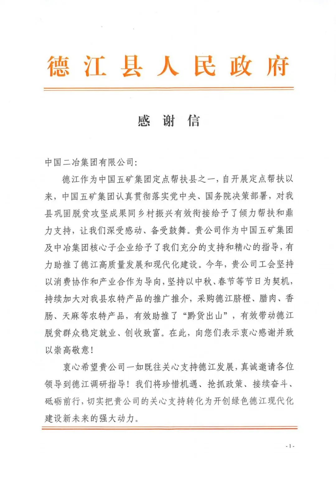 1月20日,中國二冶收到貴州省銅仁市德江縣人民政府感謝信,對中國二冶在助推“黔貨出山”,帶動德江脫貧群眾穩(wěn)定就業(yè)、創(chuàng)收致富方面作出的貢獻(xiàn)表示感謝。